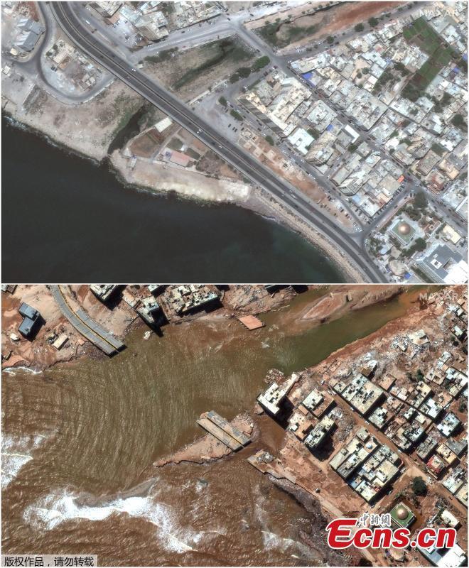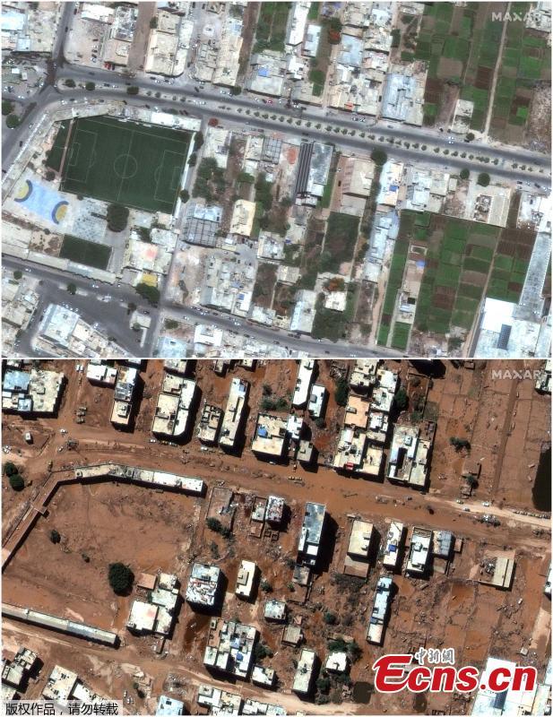 This combination of satellite images shows a neighborhood of Derna, Libya, on July 1, 2023 (top) and the same flood damaged area on Sept. 13, 2023. (Photo/Agencies)