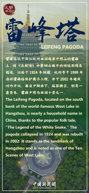 The Leifeng Pagoda, located on the south bank of the world-famous West Lake in Hangzhou, is nearly a household name in China, thanks to the popular folk tale, "The Legend of the White Snake." The pagoda collapsed in 1924 and was rebuilt in 2002. It stands as the landmark of Hangzhou and is noted as one of the Ten Scenes of West Lake.