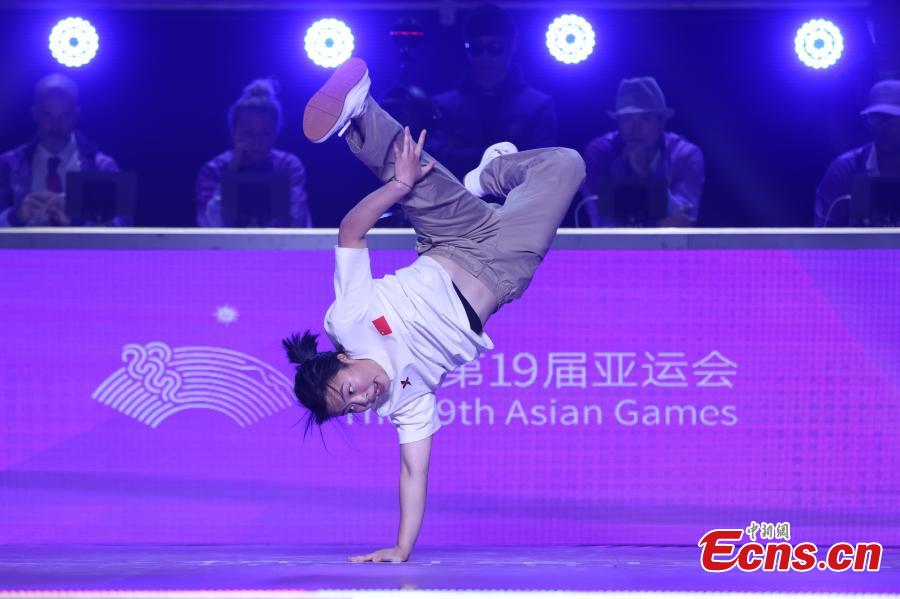 China's Liu Qingyi competes during the women's breakdancing gold medal battle at the 19th Asian Games at Gongshu Canal Sports Park Stadium in Hangzhou, east China's Zhejiang Province, Oct. 7, 2023. (Photo: China News Service/Yang Bo)