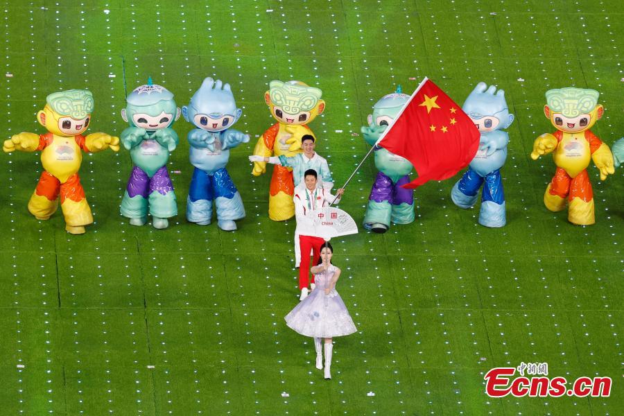 The delegation of China enters the Hangzhou Olympic Sports Center Stadium for the 19th Asian Games closing ceremony, in east China's Zhejiang Province, Oct. 8, 2023. (Photo: China News Service/Wang Dongming)