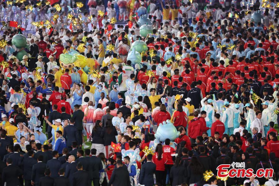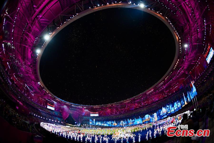 The delegations of different countries parade into the Hangzhou Olympic Sports Center Stadium during the closing ceremony of the 19th Asian Games in Hangzhou, east China's Zhejiang Province, Oct. 8, 2023. (Photo: China News Service/Wang Dongming)