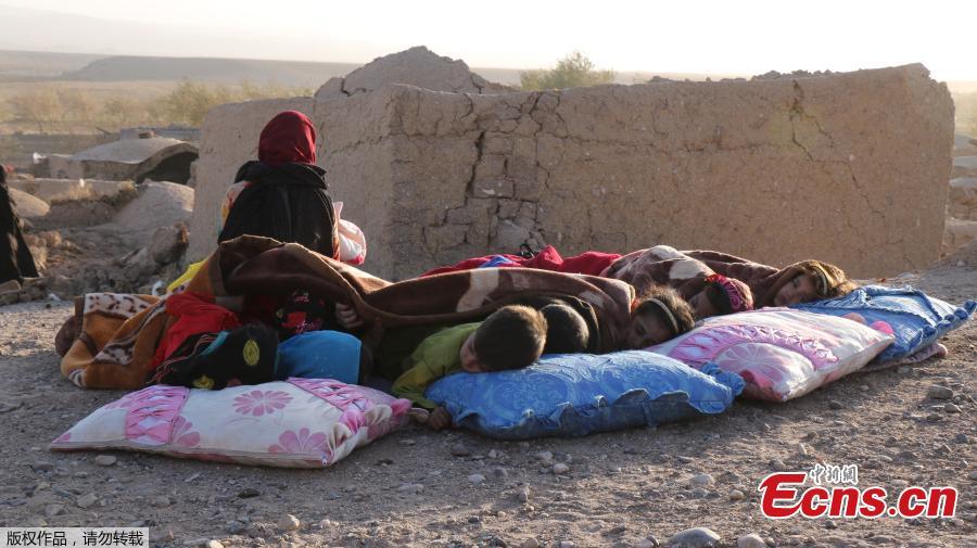 Afghan children rest under a blanket beside damaged houses after earthquake in Sarbuland village of Zendeh Jan district of Herat province, Afghanistan, Oct. 7, 2023. (Photo/Agencies)