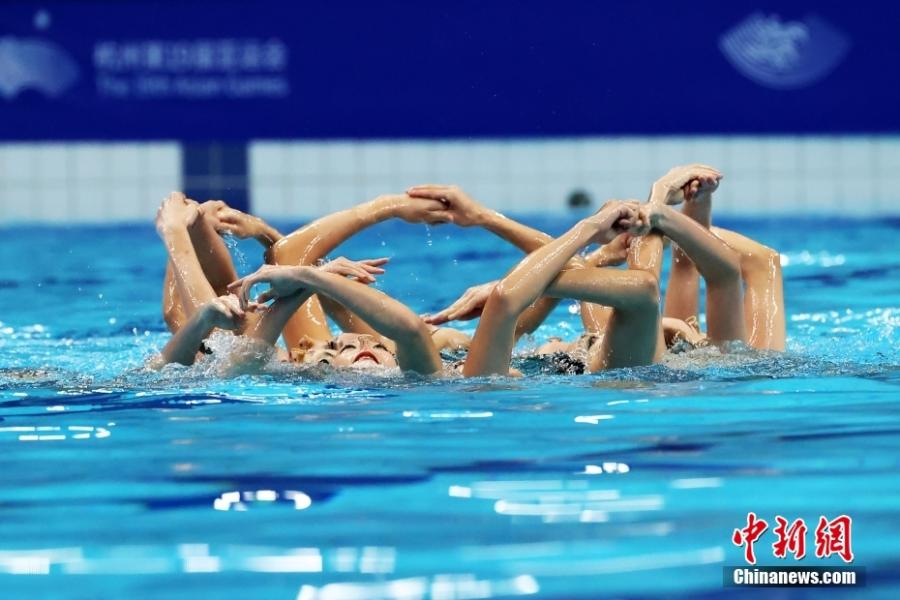 Team China competes during the Team Free Routine of Artistic Swimming at the 19th Asian Games at Hangzhou Olympic Sports Centre Aquatic Sports Arena in east China's Zhejiang Province, Oct. 8, 2023. (Photo: China News Service/Tang Yanjun)