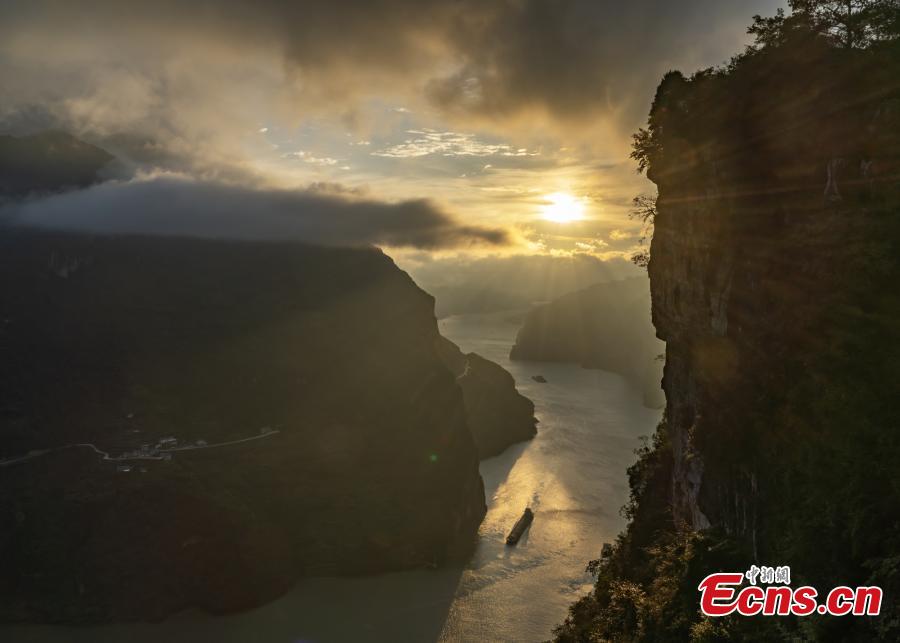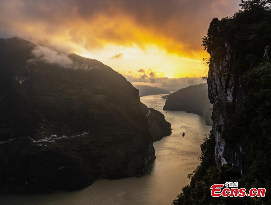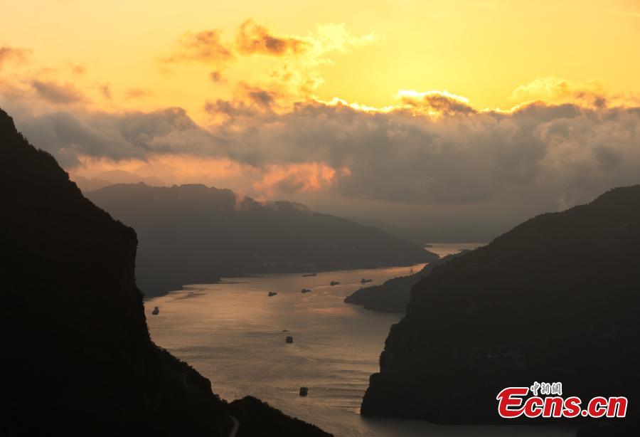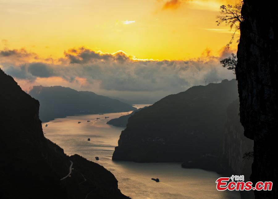 Cargo vessels pass through the Xiling Gorge, the easternmost of the Three Gorges along the Yangtze River at sunrise in Zigui County of Yichang City, central China's Hubei Province, Oct. 8, 2023. (Photo/VCG)