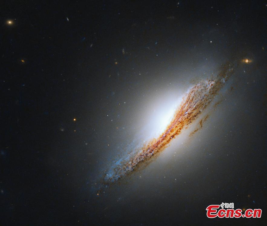 A striking orange and blue streak fills this new image from the Hubble Space Telescope. Hubble’s visible and infrared capabilities captured this edge-on view of lenticular galaxy NGC 612. It is about 400 million light-years from Earth and has a mass of around 1.1 trillion times that of our Sun. (Photo/VCG)