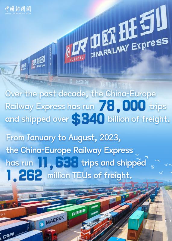 China-Europe freight trains have completed 78,000 trips in the past 10 years and shipped more than $340 billion worth of cargo in 7.4 million standard containers, Chinese Foreign Ministry spokesperson Wang Wenbin said during a routine press conference on Tuesday.China-Europe freight trains now reach more than 200 cities in 25 European countries, and more than 100 cities in 11 Asian countries and regions, after their operations started in 2013.