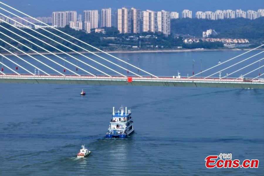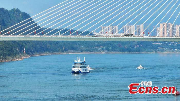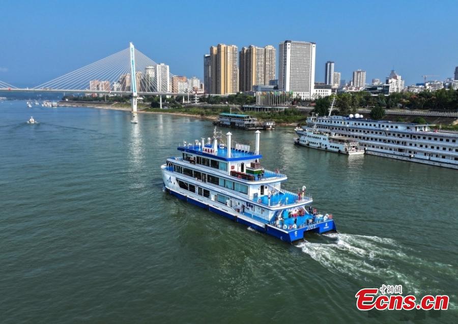 China's first hydrogen-powered vessel, Three Gorges Hydrogen Boat No. 1, sets sail from the Three Gorges Tourist Center in Yichang, central China's Hubei Province, Oct. 11, 2023. (Photo/VCG)