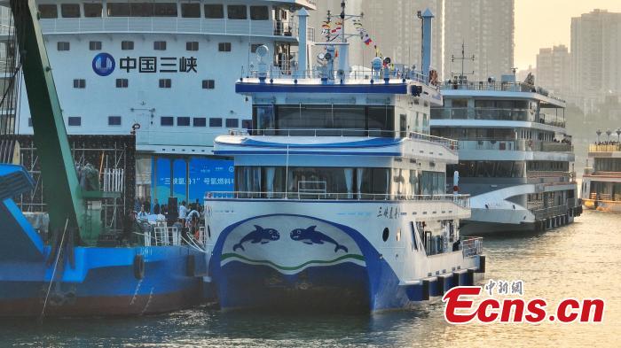 China's first hydrogen-powered vessel, Three Gorges Hydrogen Boat No. 1, docks at the Three Gorges Tourist Center in Yichang, central China's Hubei Province, Oct. 11, 2023. (Photo/VCG)