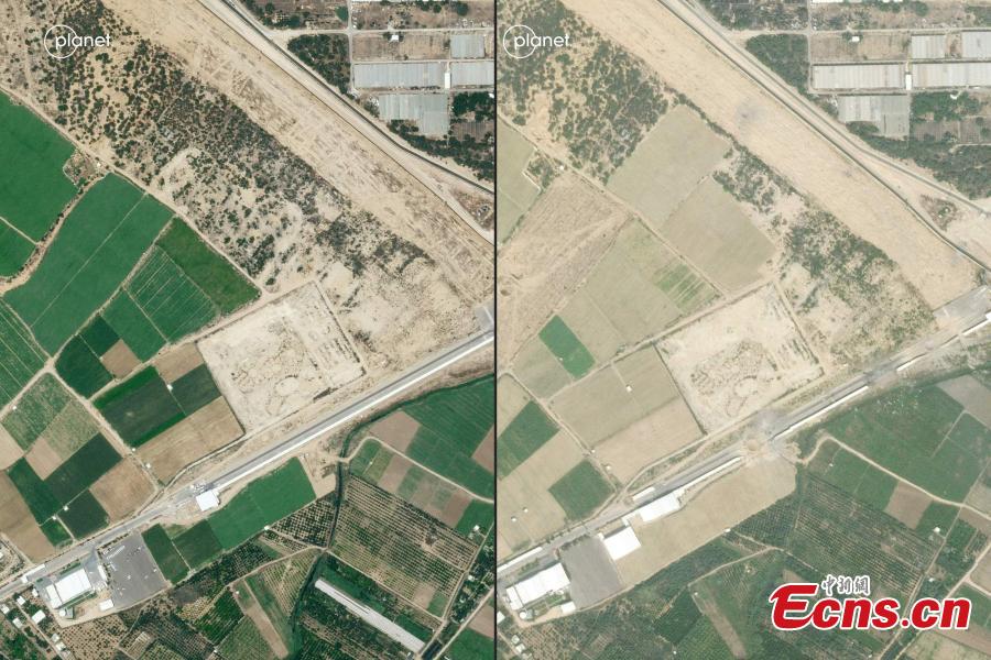 This combination of satellite images shows the Erez checkpoint, border of Gaza and Israel on June 5, 2023 (L) and Oct. 8, 2023 (R). (Photo/VCG)