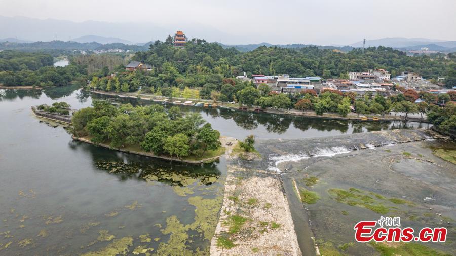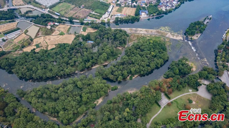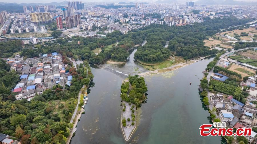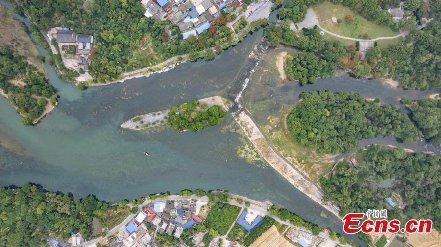 Aerial view of Lingqu Canal, one of the world's oldest and most well-preserved artificial canals, in Xing'an County of Guilin, south China's Guangxi Zhuang Autonomous Region, Oct. 11, 2023. (Photo: China News Service/Chen Guanyan)
