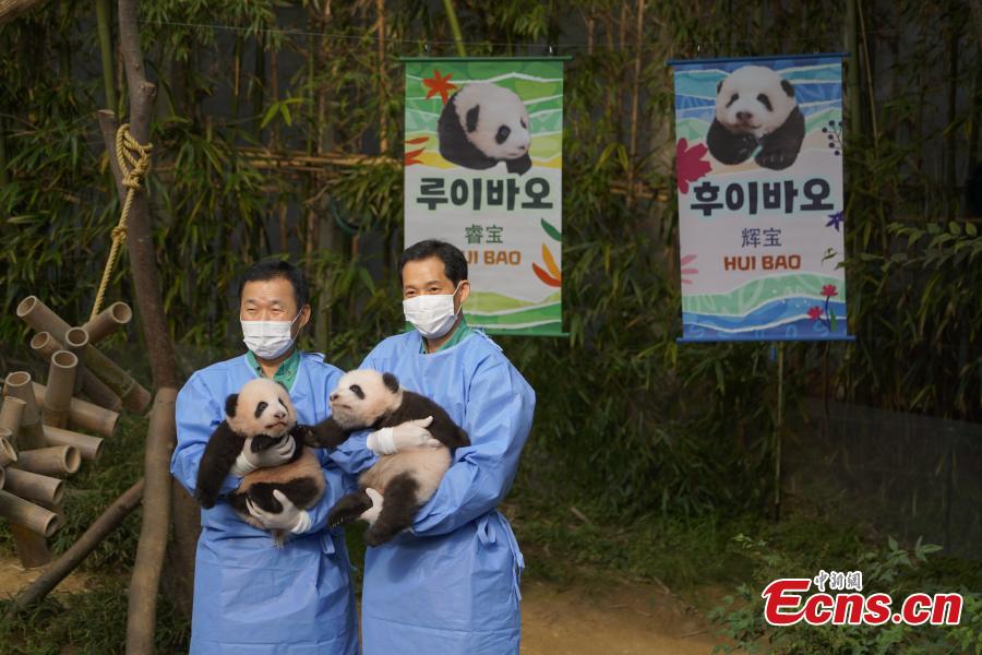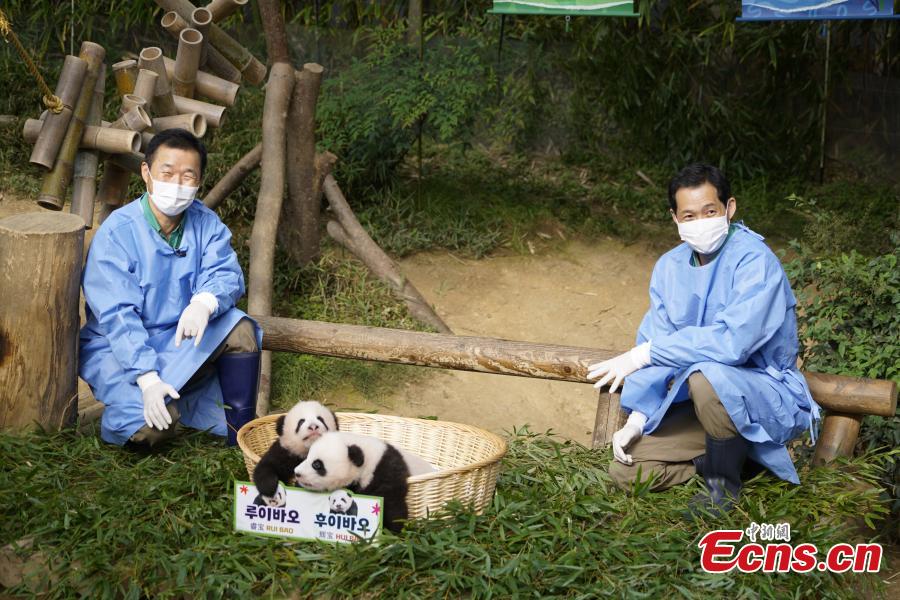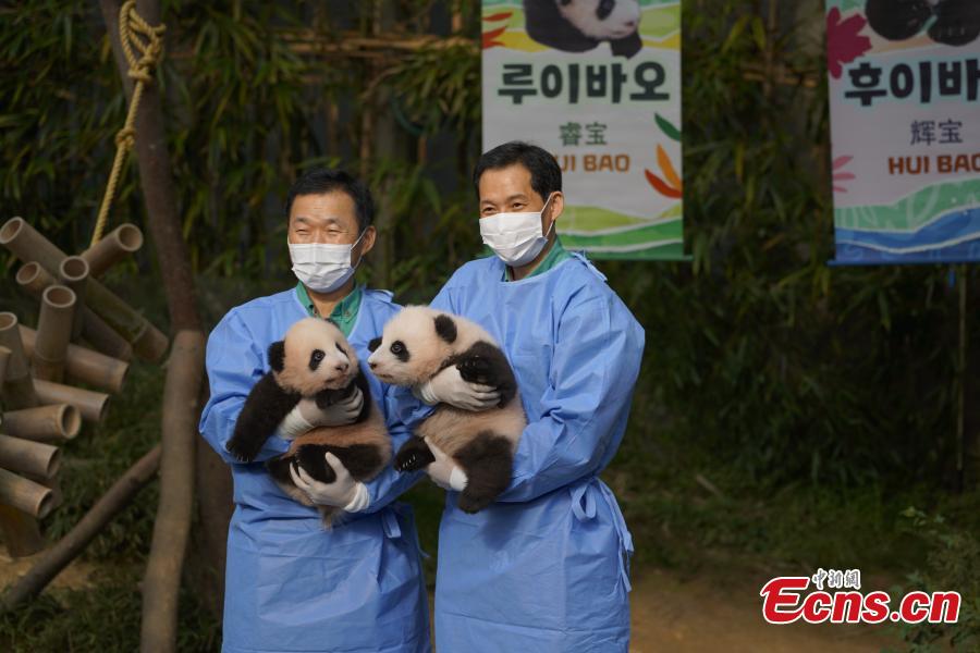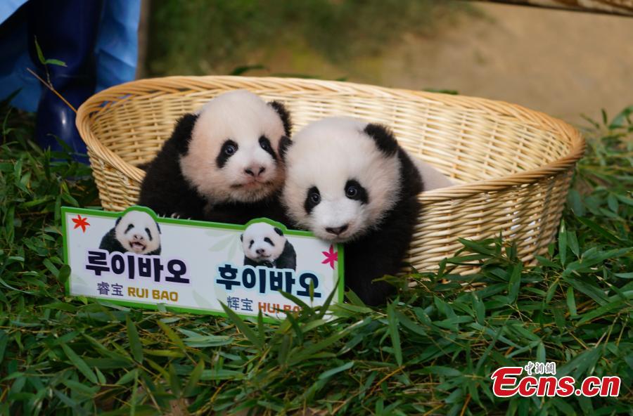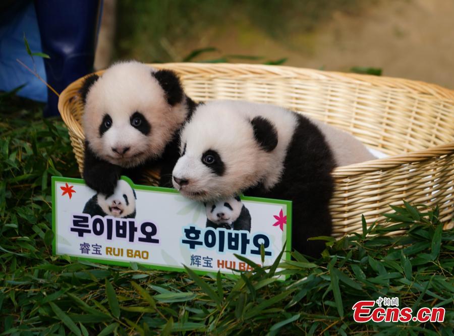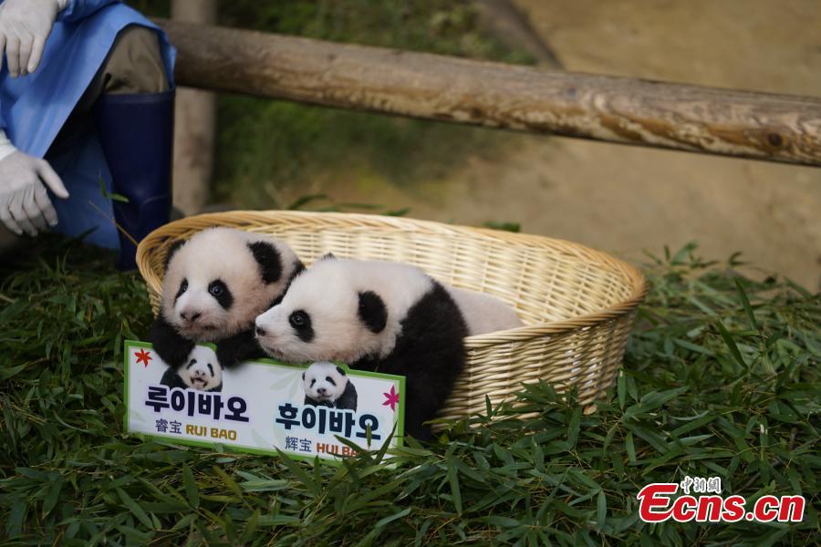 Female giant panda twin cubs meet the public for first time at Everland Resort in Yongin, South Korea, Oct. 12, 2023. (Photo: China News Service/Liu Xu)