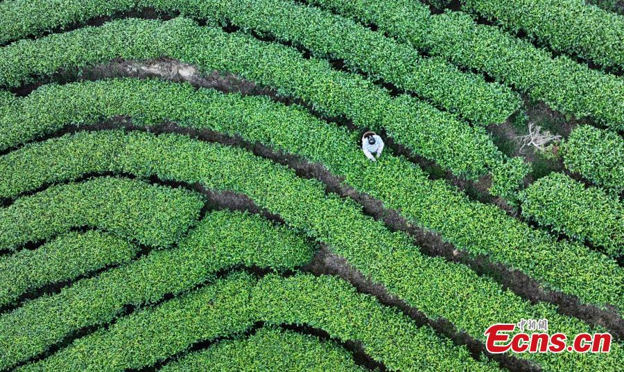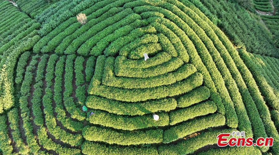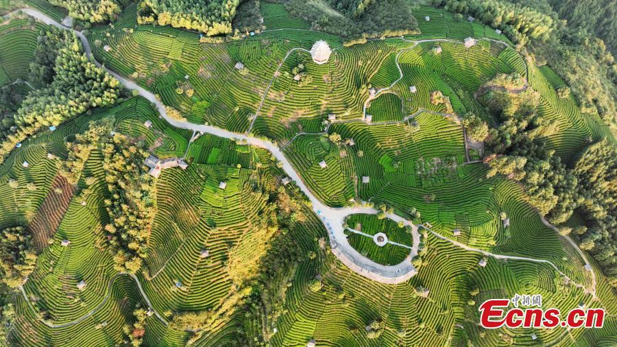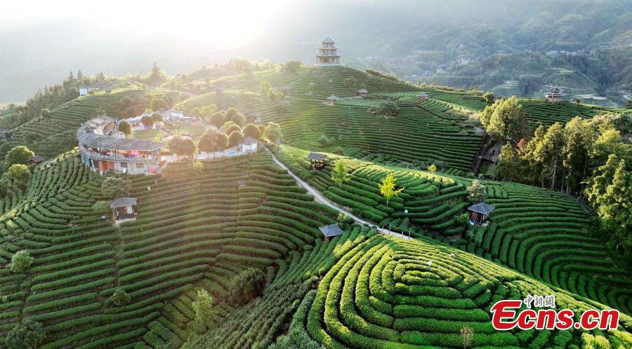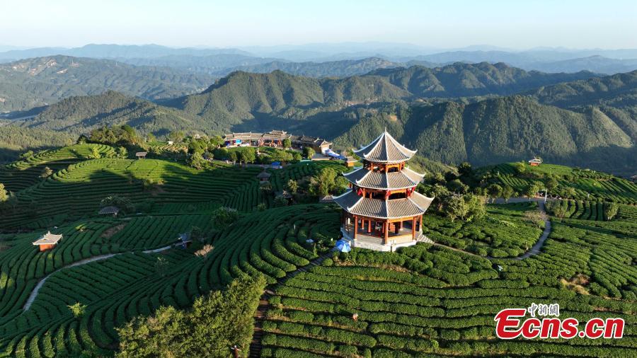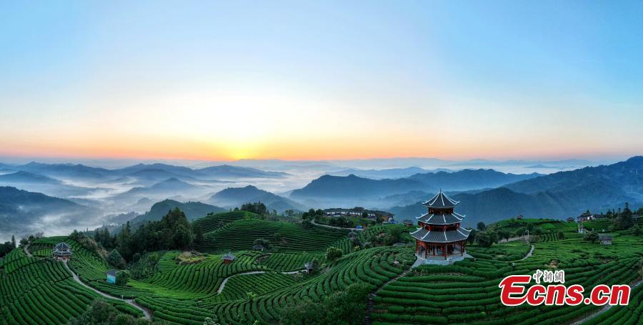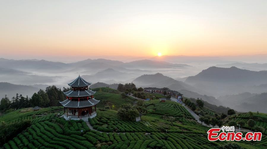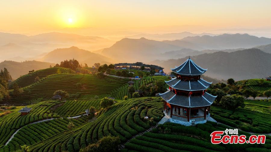 Beautiful sunrise scenery at a tea garden at Sanjiang Dong Autonomous County, south China's Guangxi Zhuang Autonomous Region, Oct. 16, 2023. (Photo: China News Service/Gong Pukang)