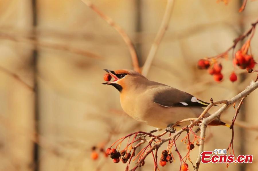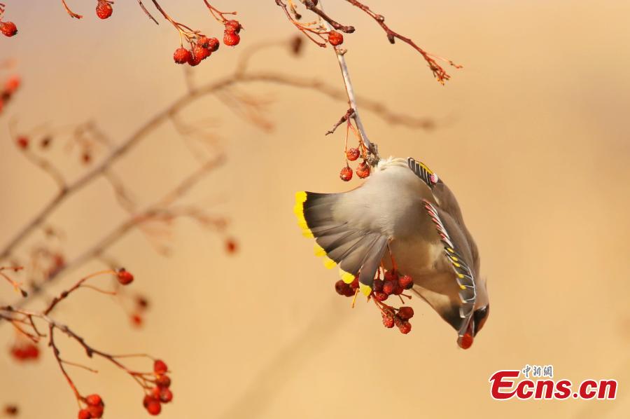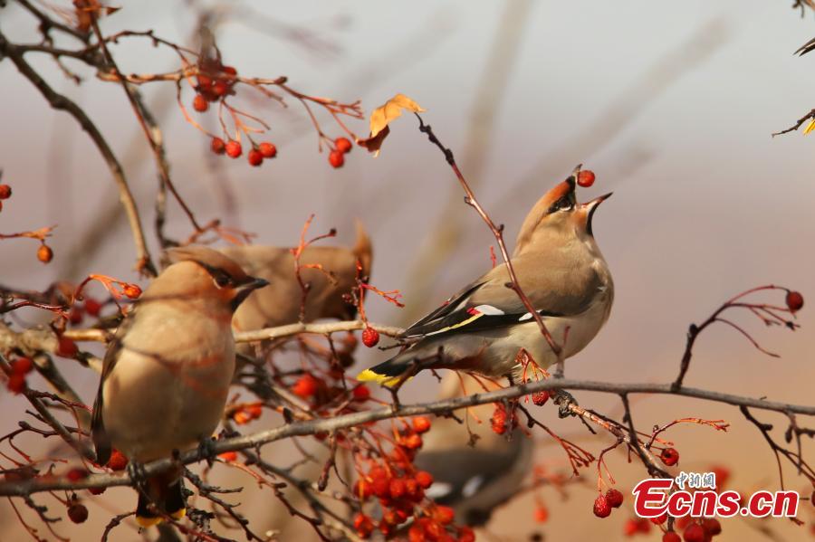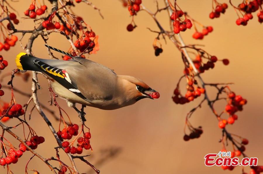 A flock of bohemian waxwings pick fruit from a tree in Ergune, Hulunbuir city, north China's Inner Mongolia autonomous region. (Photo: China News Service/Wu Zhiying)