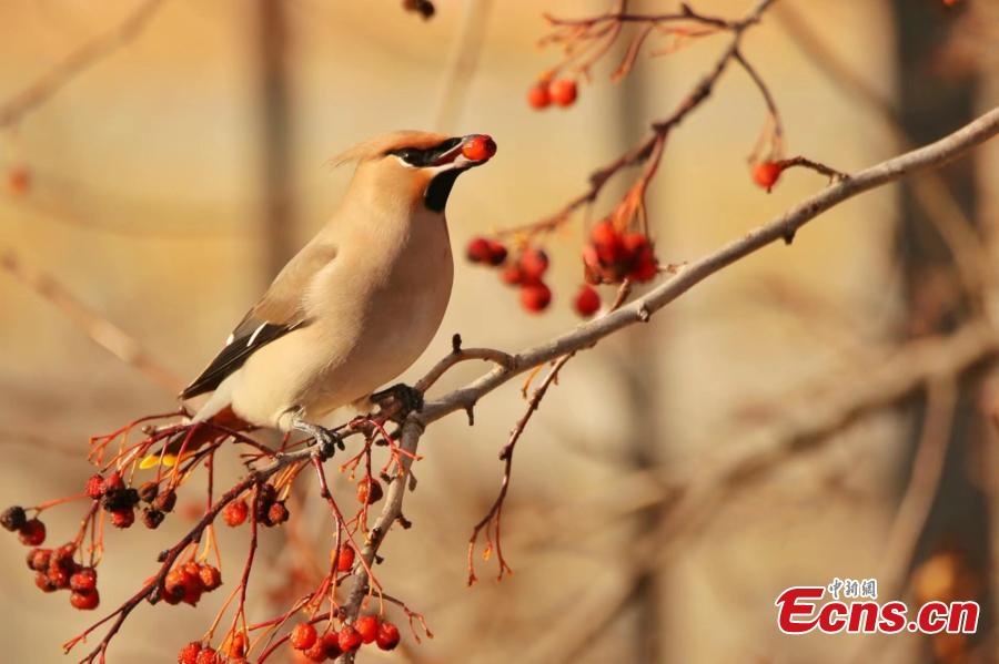 A waxwing picks fruit from a tree in Ergune, Hulunbuir city, north China's Inner Mongolia autonomous region. (Photo: China News Service/Wu Zhiying)