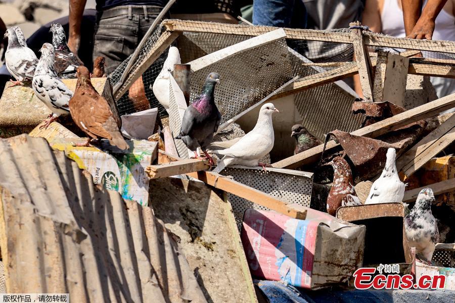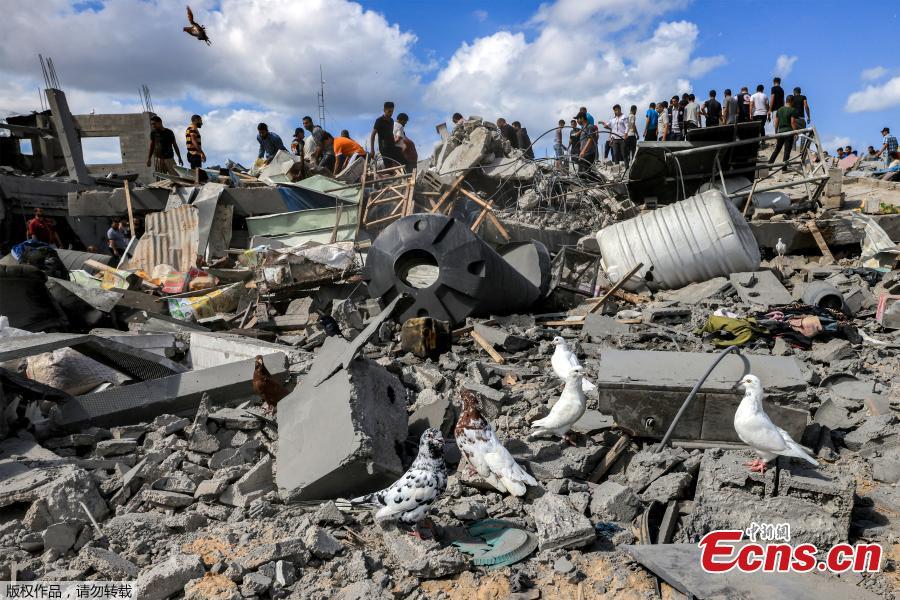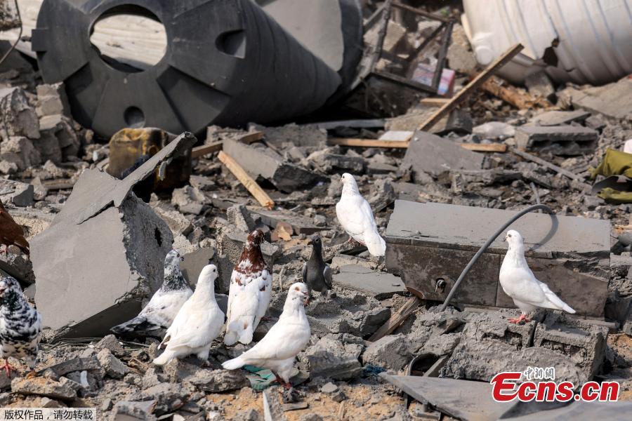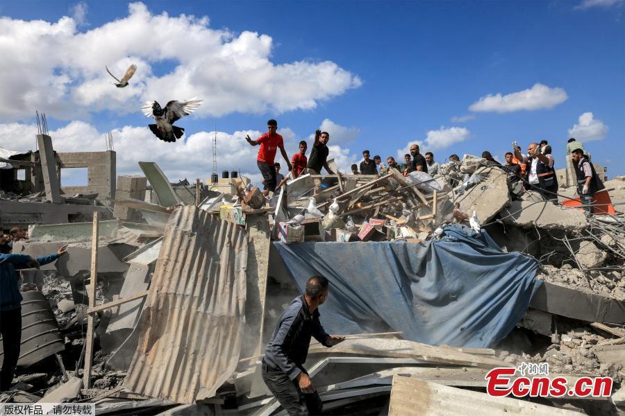 Pigeons fly as people inspect the remains of a destroyed building following Israeli strikes in Khan Yunis, the southern Gaza Strip, Oct. 18, 2023. (Photo/Agencies)