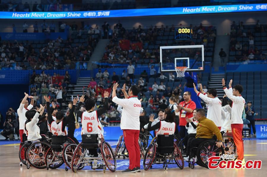 Members of Team China celebrate after winning Women's Gold Medal Match of the Wheelchair Basketball at the 4th Asian Para Games at Hangzhou Olympic Sports Centre Gymnasium in east China's Zhejiang Province, Oct. 26, 2023. (Photo: China News Service/Wang Gang)