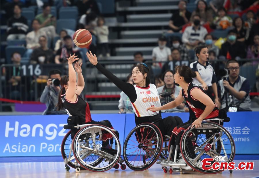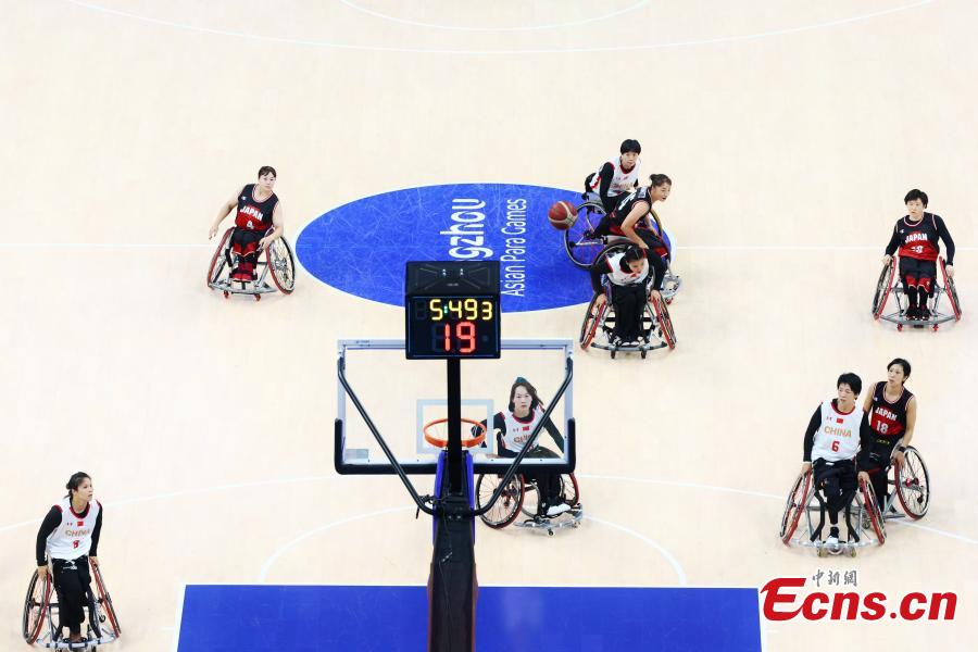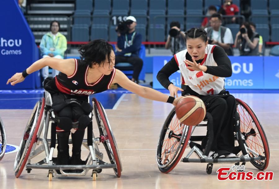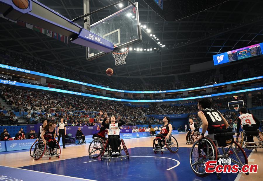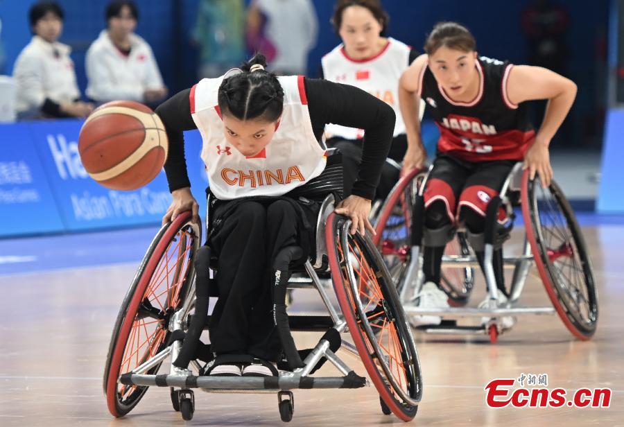 Players compete during the Women's Wheelchair Basketball final between China and Japan at the 4th Asian Para Games at Hangzhou Olympic Sports Centre Gymnasium in east China's Zhejiang Province, Oct. 26, 2023. (Photo: China News Service/Wang Gang)