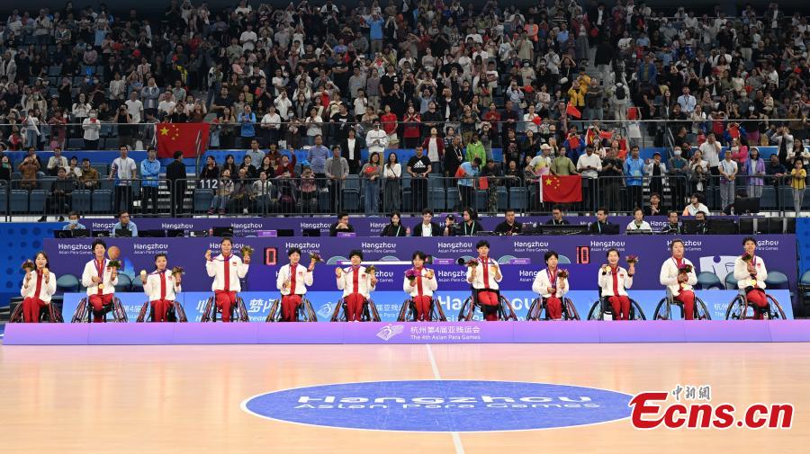 Players of China pose for photos during the awarding ceremony after the Women's Gold Medal Match of the Wheelchair Basketball between China and Japan at the 4th Asian Para Games at Hangzhou Olympic Sports Centre Gymnasium in east China's Zhejiang Province, Oct. 26, 2023. (Photo: China News Service/Wang Gang)