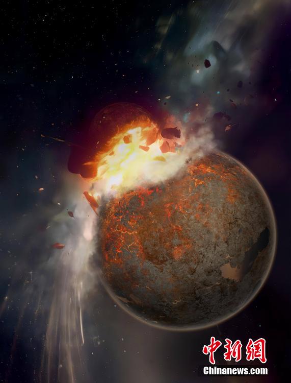 An artist's concept shows proto-planet Theia colliding with the Earth to eventually form the Moon, possibly leaving two giant structures embedded in the Earth’s mantle 4.5 billion years ago. (Photo provided to China News Service)