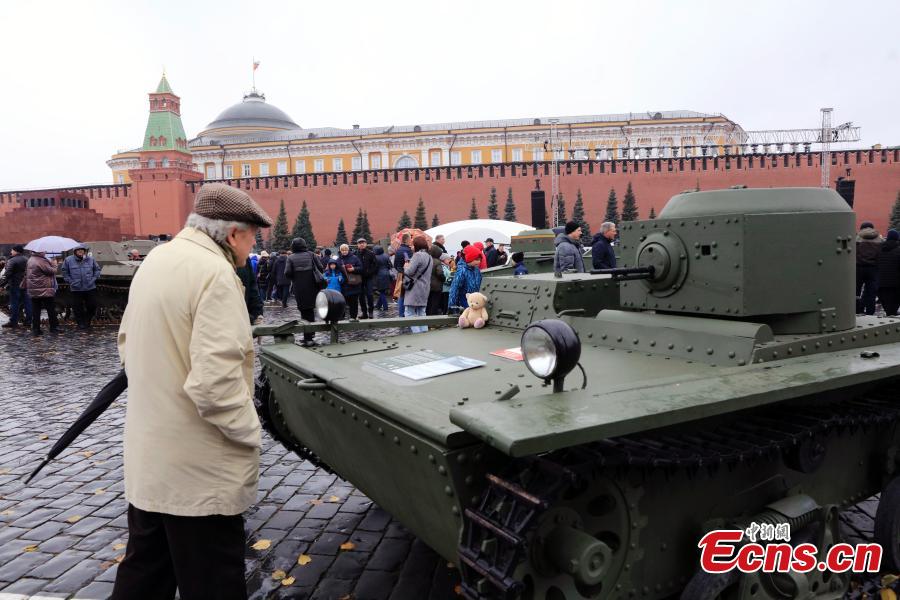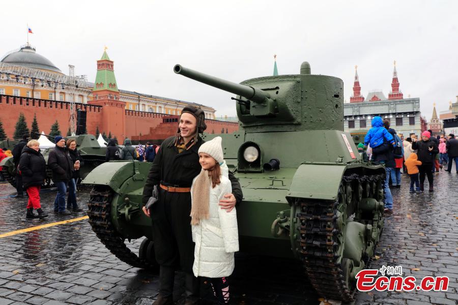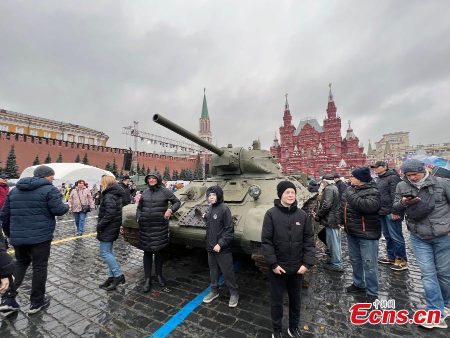 People visit an outdoor exhibition commemorating the military parade in 1941 at Red Square in Moscow, Russia, Nov. 6, 2023. (Photo: China News Service/Tian Bing)