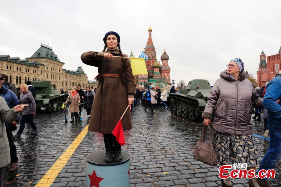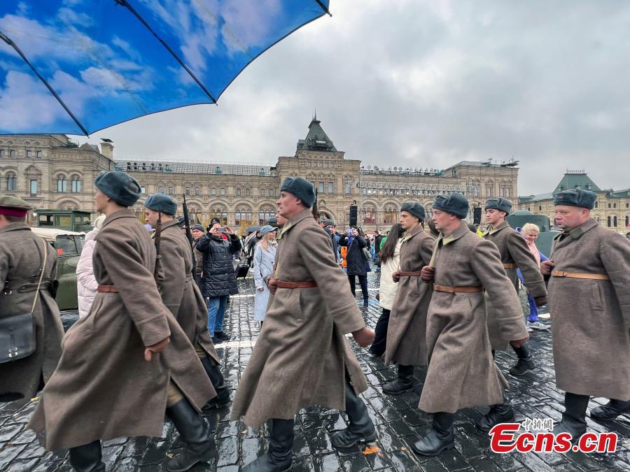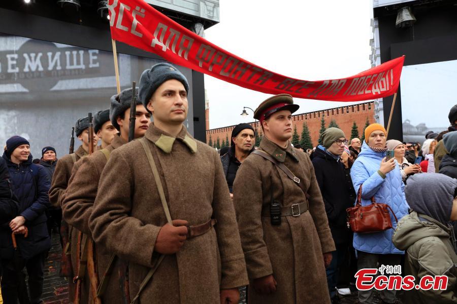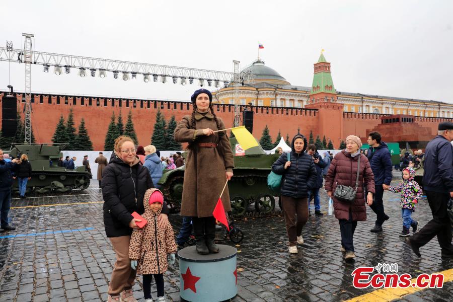Actors in costumes parade at an outdoor exhibition commemorating the military parade in 1941 at Red Square in Moscow, Russia, Nov. 6, 2023. (Photo: China News Service/Tian Bing)
