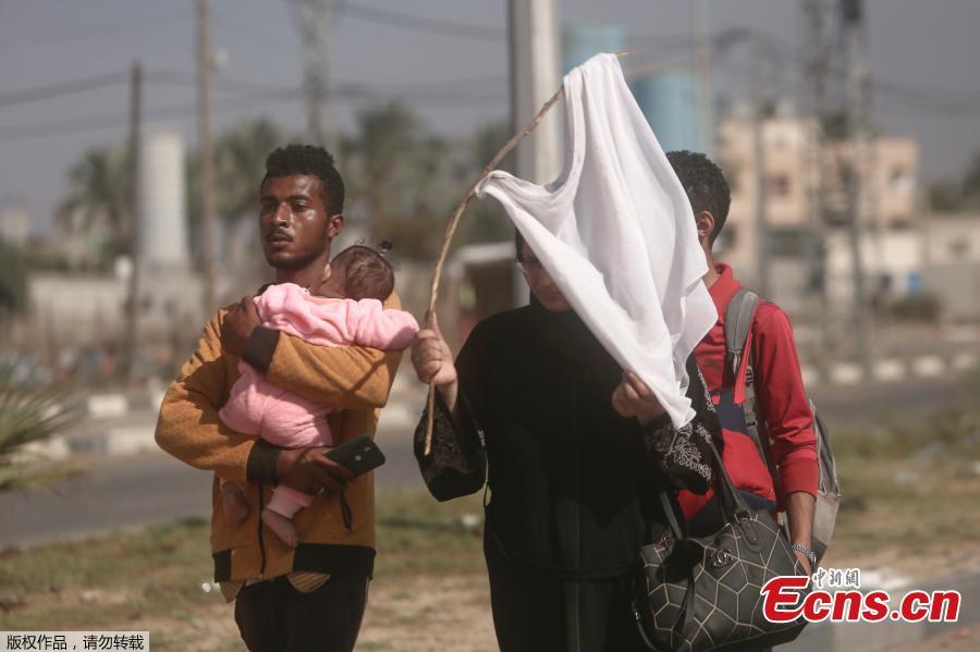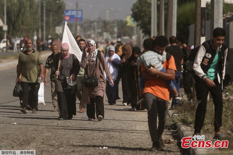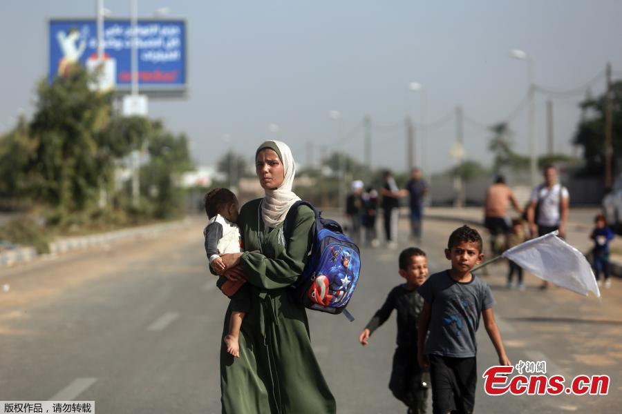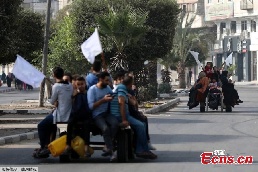 Palestinian civilians wave a white flag as they walk along Salah al-din Road in Gaza City, Nov. 7, 2023. (Photo/Agencies)