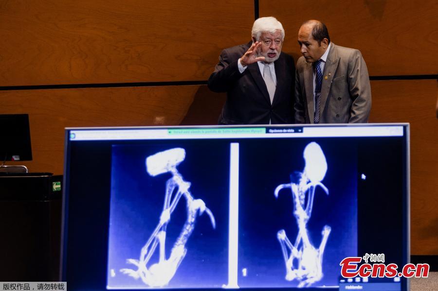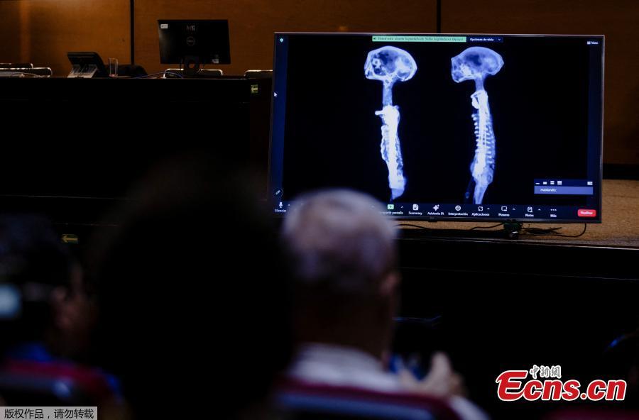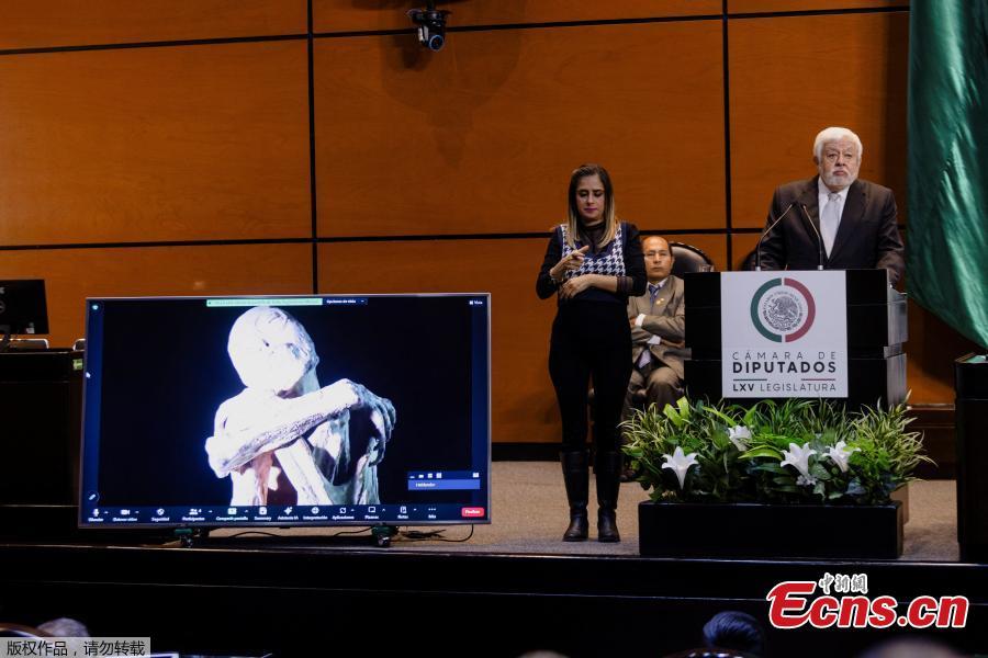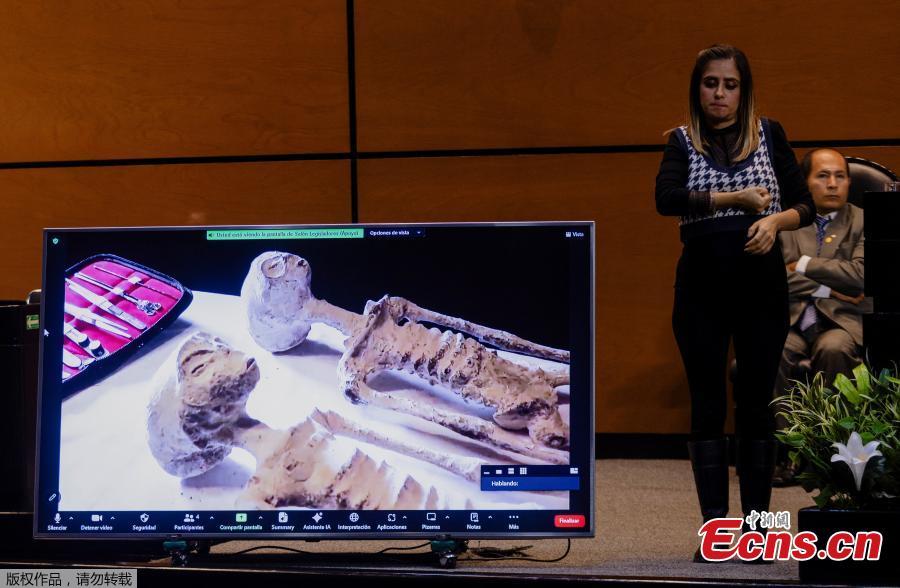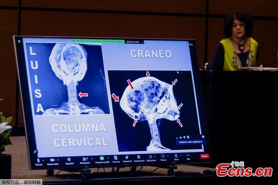 A screen displays images as Mexican journalist and UFO enthusiast Jaime Maussan hosts a second briefing on unidentified flying objects, known as UFOs, at Mexican Congress in Mexico City, Mexico, Nov. 7, 2023. (Photo/Agencies)