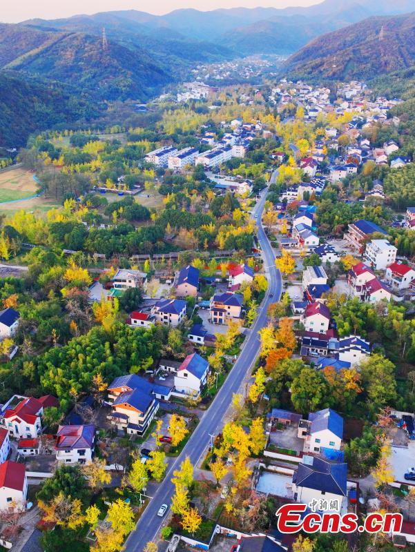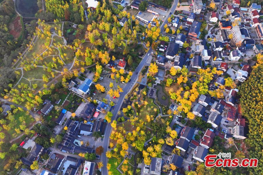 Golden ancient ginkgo trees amidst village houses become a tourist hit in Changxing County of Huzhou, east China's Zhejiang Province, Nov. 20, 2023. (Photo provided to China News Service)