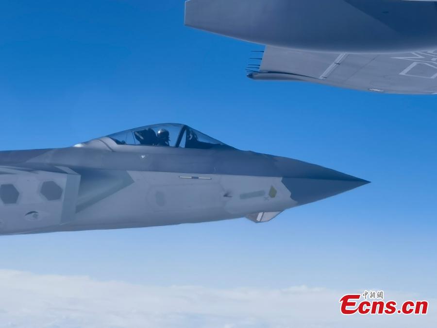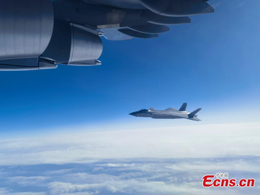 Escorted by a J-20 stealth fighter jets, an Y-20 large transport aircraft attached to the PLA Air Force carrying 25 remains of Chinese People Volunteers martyrs killed in the 1950-53 Korean War flies back to Shenyang, northeast China's Liaoning Province, Nov. 23, 2023. (Photo: China News Service/Huang Can)