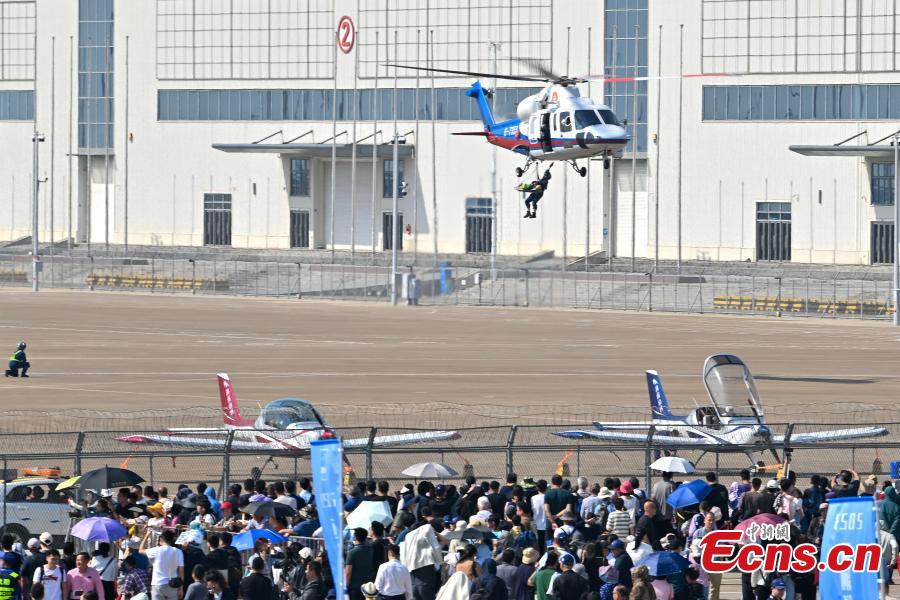 China's Nanhai No. 1 Rescue Flying Service Team performs rescue drill during the 2023 Aero Asia show in Zhuhai, south China's Guangdong Province, Nov. 23, 2023. (Photo: China News Service/Chen Jimin)