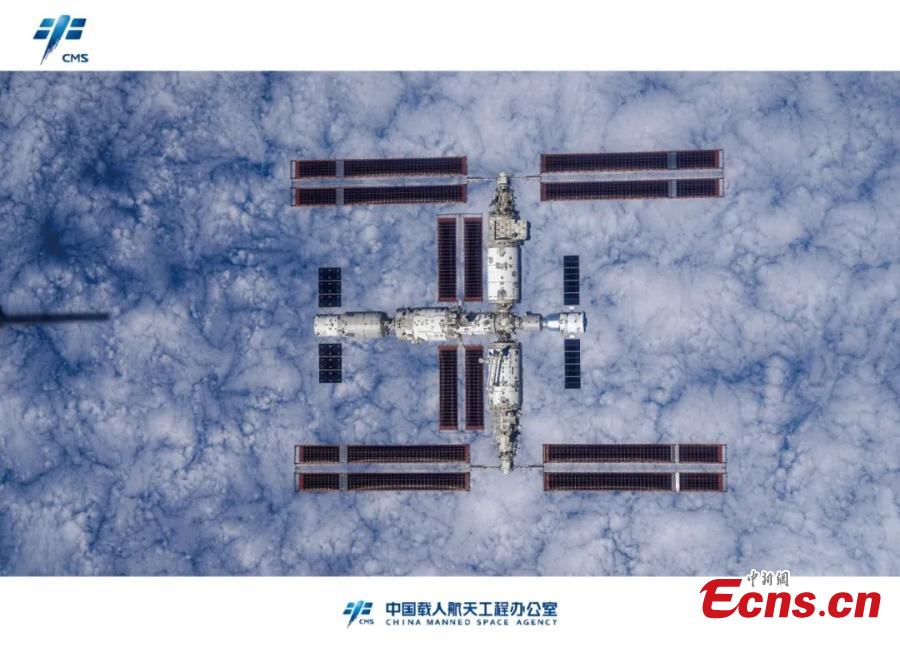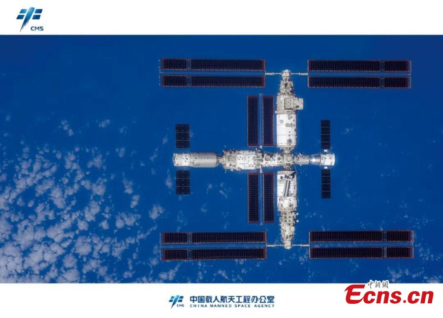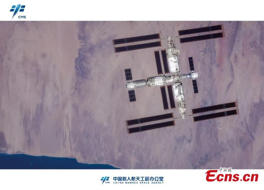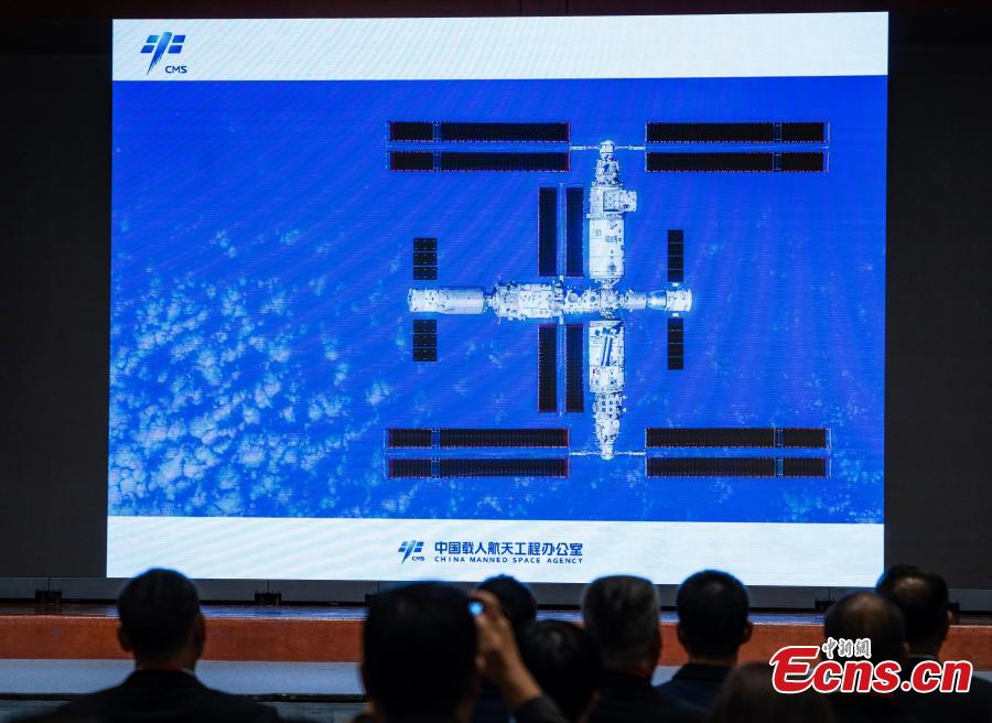 A high resolution panorama image displaying the space station taken from Shenzhou-16 manned spaceship is released during a press conference at the Hong Kong Convention and Exhibition Center, the Hong Kong Special Administrative Region, Nov. 28, 2023. (Photo: China News Service/Hou Yu)
