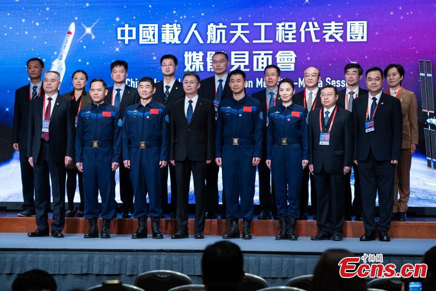 Members of China's manned space program delegation pose for a group photo after a press conference at the Hong Kong Convention and Exhibition Center, the Hong Kong Special Administrative Region, Nov. 28, 2023. (Photo: China News Service/Hou Yu)