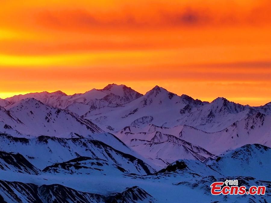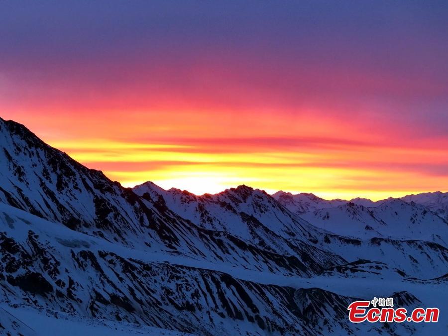 Sunrise glow fulfills the sky on Gangshika snow peak, the highest in the eastern section of the Qilian Mountains, at Menyuan County in Qinghai Province. (Photo: China News Service/Ma Wenjie)