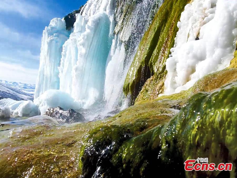 The frozen Qicai waterfall at the foot of Gangshika snow peak, the highest in the eastern section of the Qilian Mountains, at Menyuan County in Qinghai Province. (Photo: China News Service/Ma Wenjie)