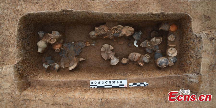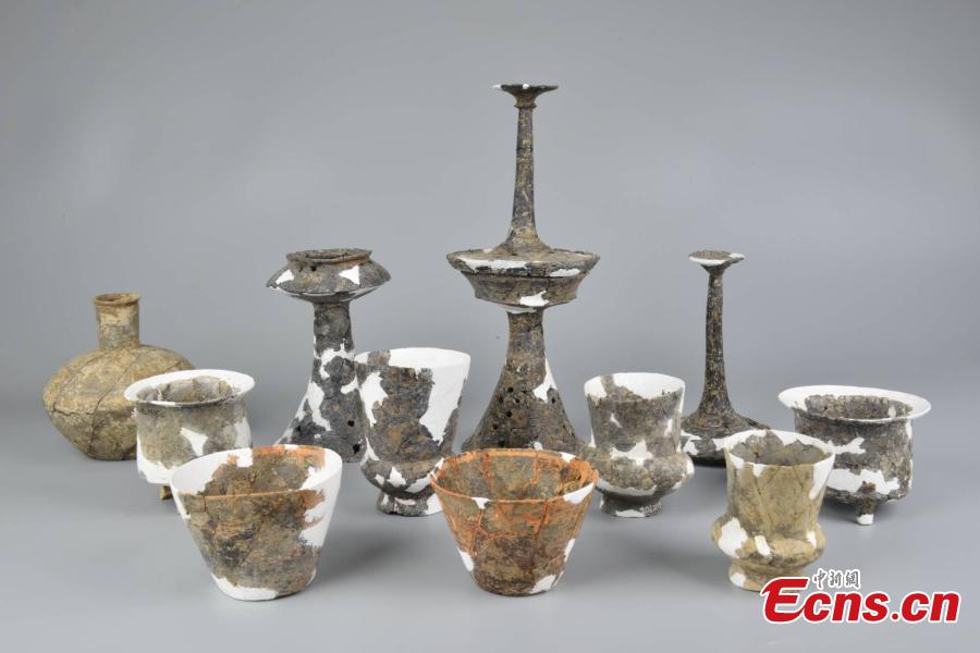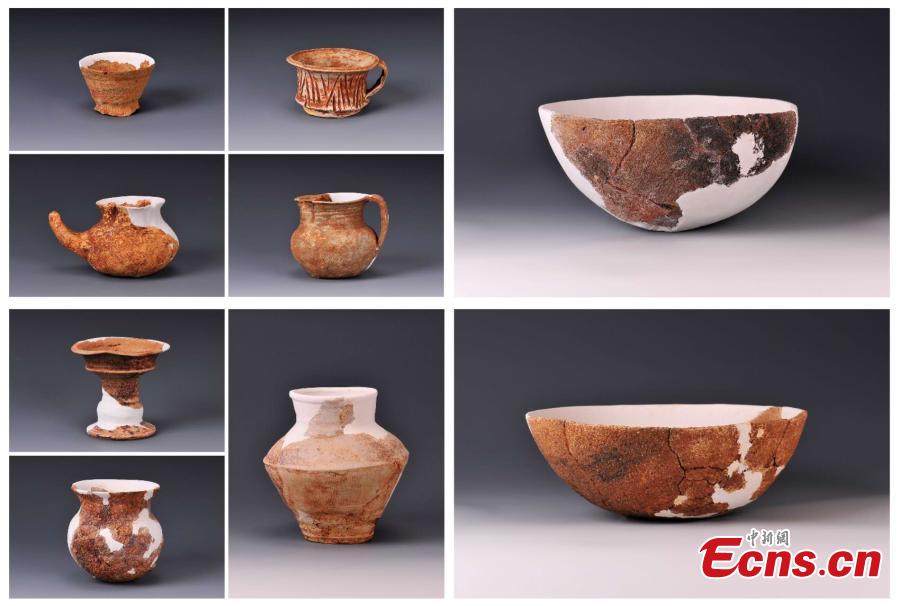 Photo shows cultural relics excavated from the Chenghe ruins of the Qujialing Culture in Shayang, central China's Hubei Province, Nov. 29, 2023. Chenghe ruins indicates the techniques of building water conservancy facilities in the Neolithic Age in the middle reaches of the Yangtze River. (Photo provided to China News Service)