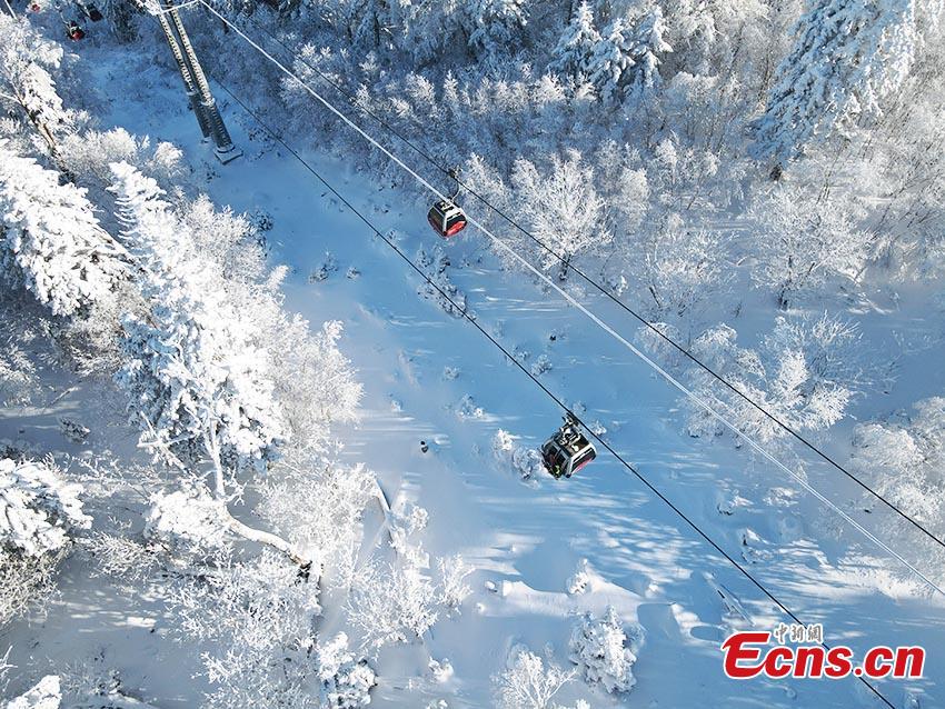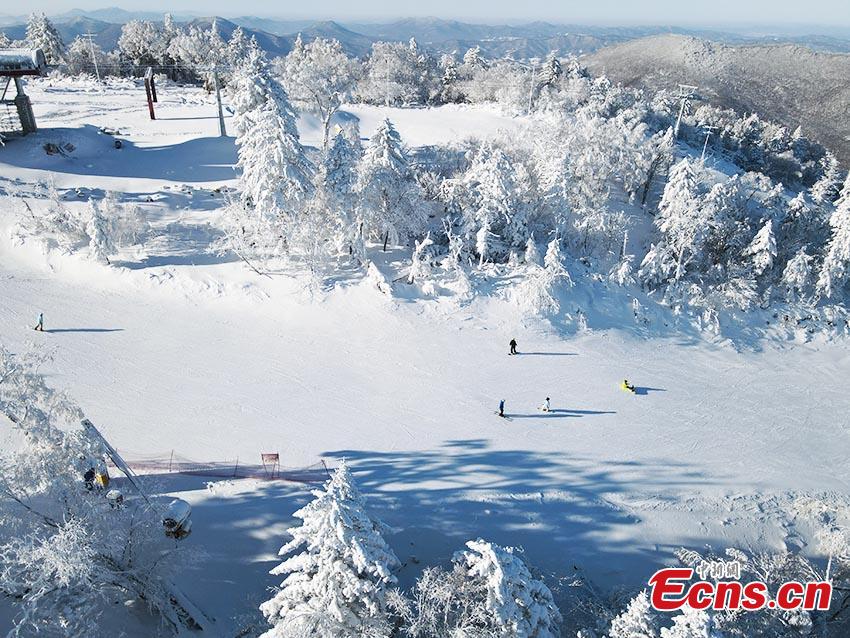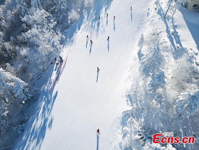Skiers slide down on a ski slope at Beidahu ski resort, northeast China's Jilin Province, Nov. 30, 2023. Trees are covered with snow and rime, creating a magical landscape. (Photo: China News Service/Cang Yan)