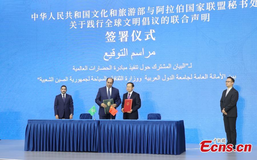 A joint statement aimed at further implementing the Global Civilization Initiative is signed between China and the Arab League during the first Liangzhu Forum in Hangzhou, east China's Zhejiang Province, Nov. 3, 2023. (Photo: China News Service/Wang Gang)