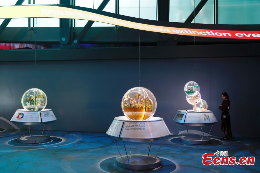 Photo shows an exhibition area on climate change at the Green Zone of the 28th session of the Conference of the Parties to the United Nations Framework Convention on Climate Change (COP28), in Dubai, the United Arab Emirates, Dec. 4, 2023. (Photo: China News Service/Han Haidan)