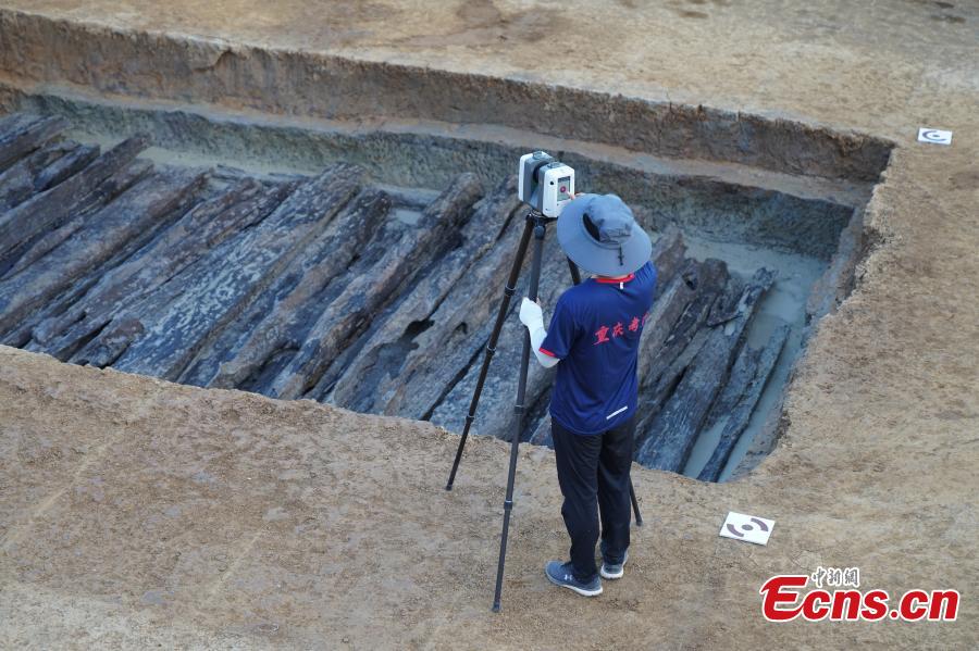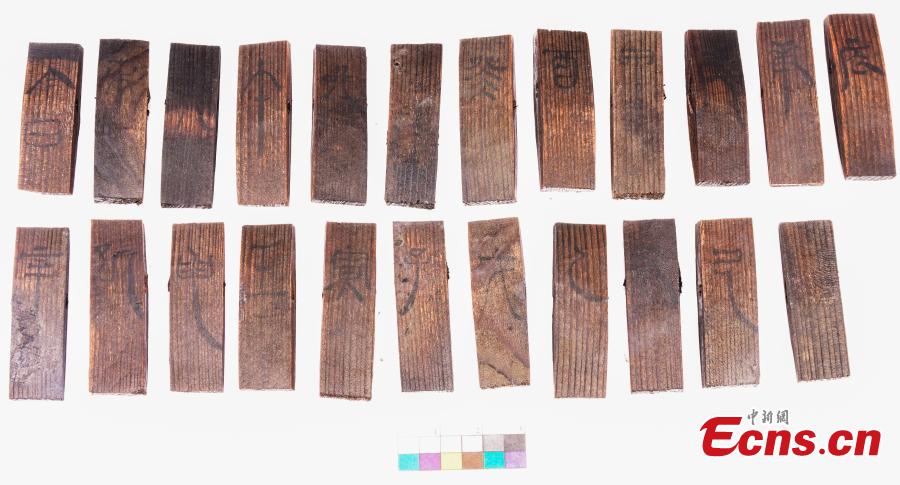 Wood slips are unearthed from a tomb dating back to the Western Han Dynasty (202 B.C.-25 A.D.) in Dulong district of Chongqing, Dec. 5, 2023. (Photo provided to China News Service)