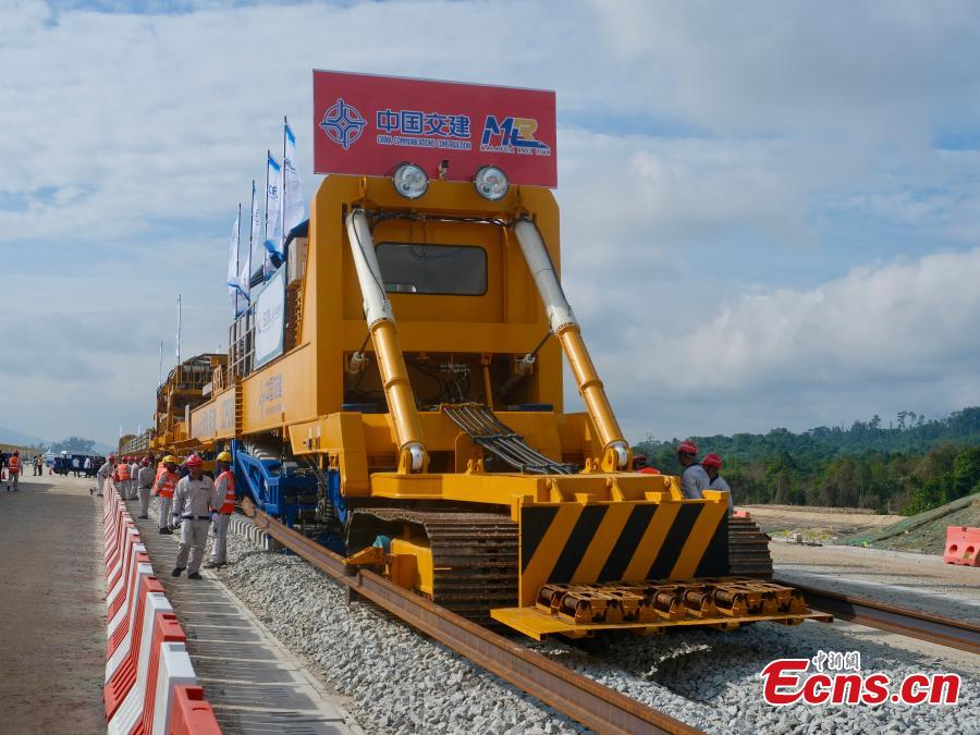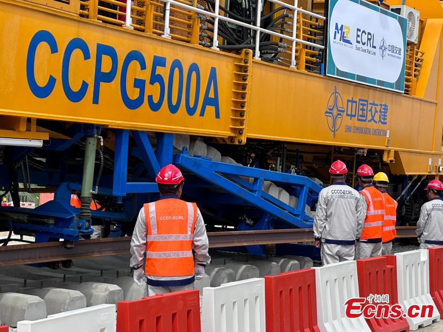The first track for the East Coast Rail Link (ECRL) project is underway with the CCPG500A track laying machine in Kuantan, Malaysia on Dec. 11, 2023. (Photo: China News Service/Chen Yue)