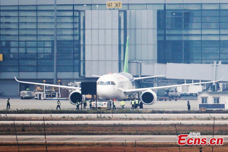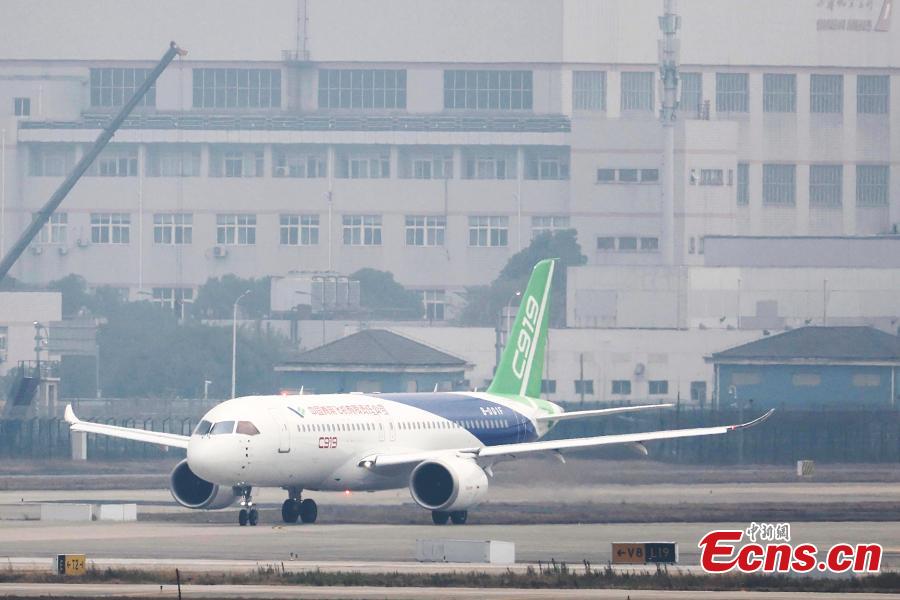 A C919, China's self-developed large passenger aircraft, taxies on a runway at Pudong International Airport in Shanghai, Dec. 12, 2023. (Photo: China News Network/Yin Liqin)