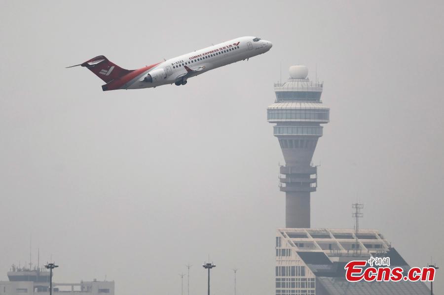 An ARJ21, domestically developed Chinese passenger jetliner, takes off from Pudong International Airport in Shanghai, Dec. 12, 2023. (Photo: China News Network/Yin Liqin)