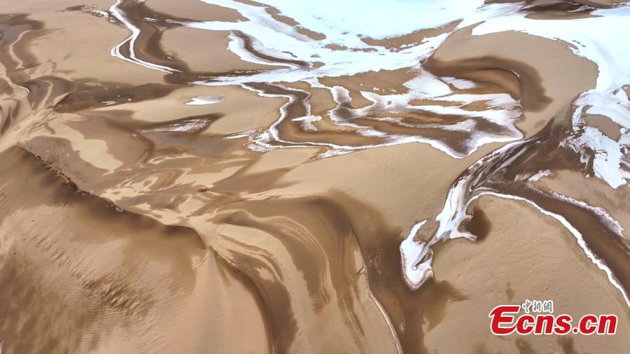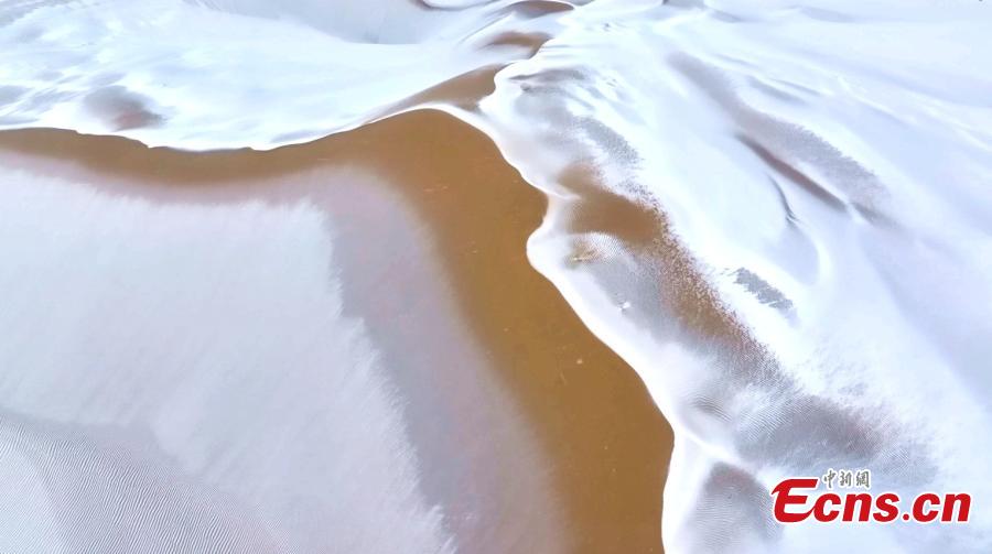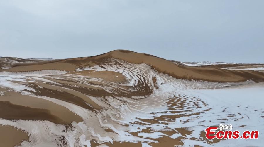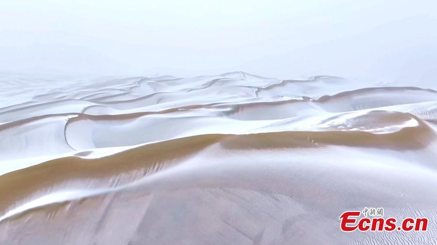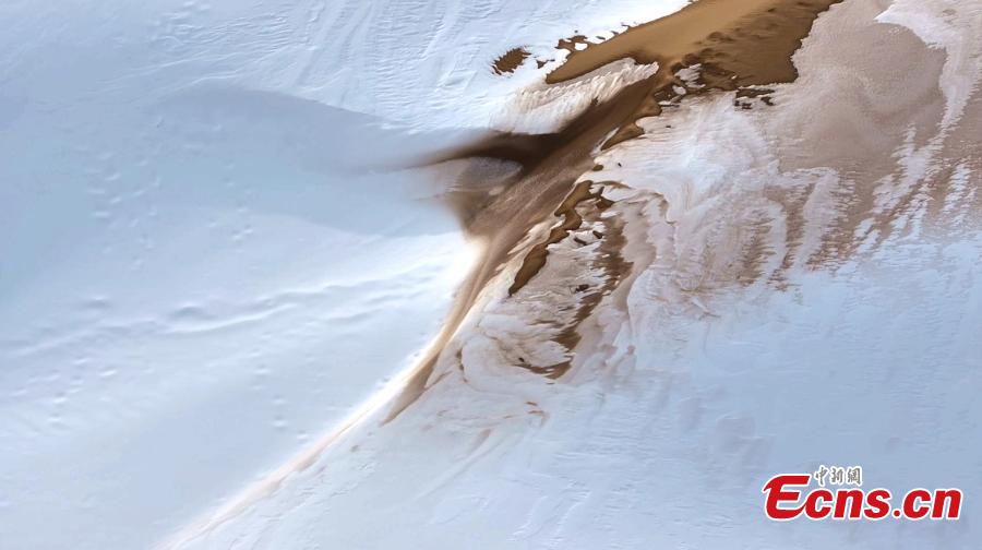 Massive sand dunes are clad in a white layer of snow, creating a picturesque landscape in north China's Inner Mongolia Autonomous Region. (Photo: China News Service/Wang Kai)