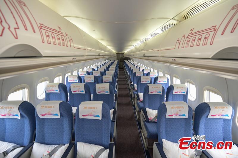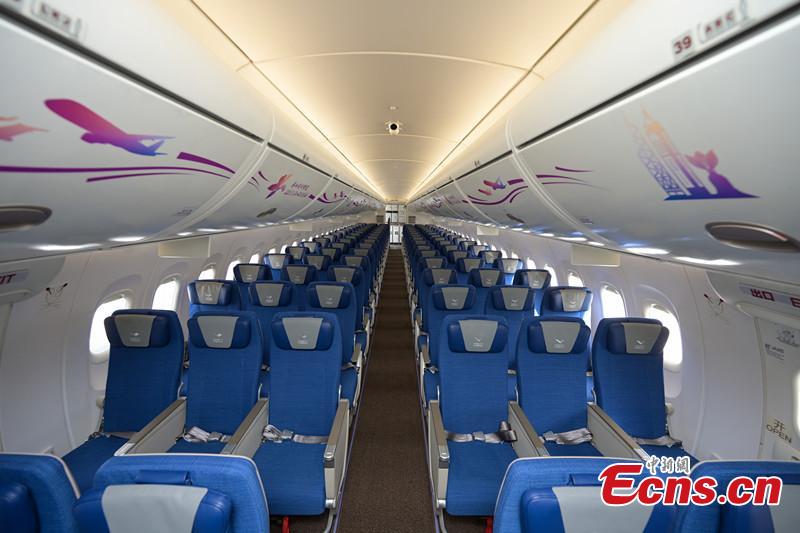 An interior view of China's home grown ARJ21 aircraft displayed at Hong Kong International Airport, Dec. 13, 2023. (Photo: China News Network/Chen Yongnuo)