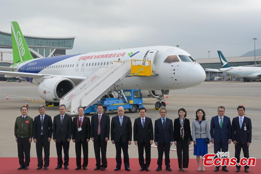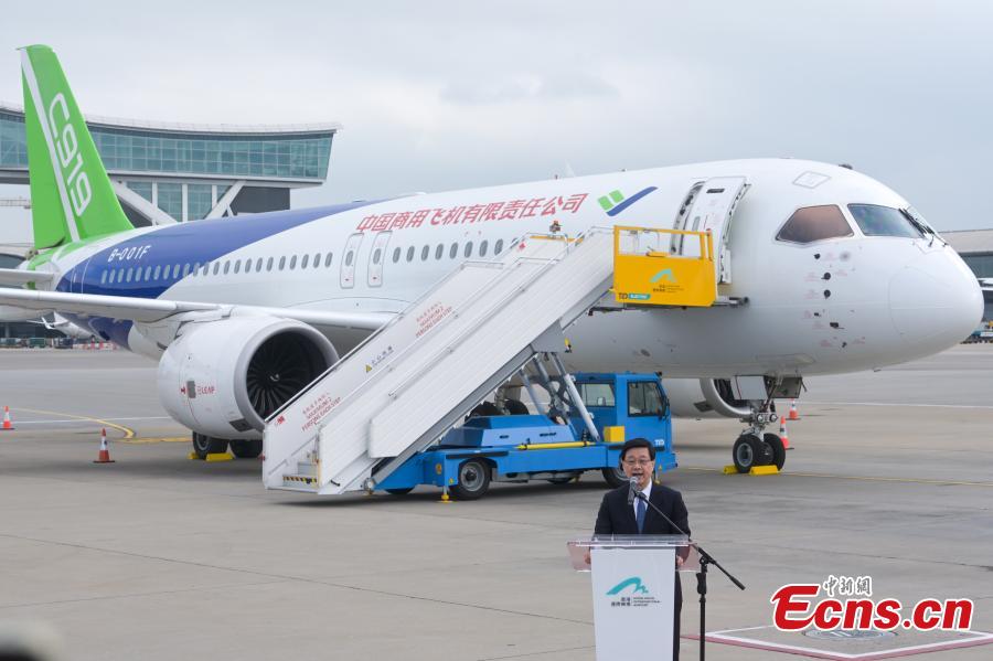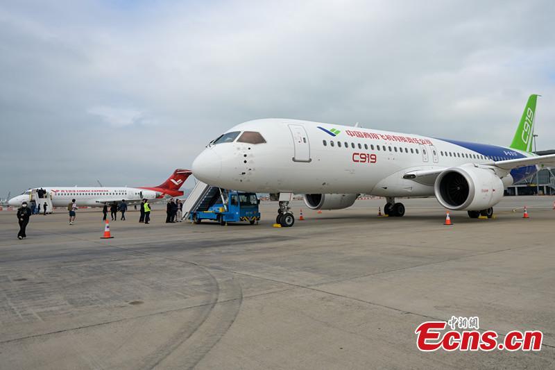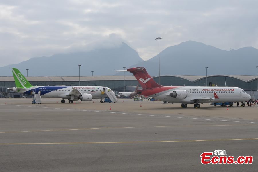Two China's home grown aircraft C919 (F) and ARJ21 stop at Hong Kong International Airport, Dec. 13, 2023. (Photo: China News Network/Chen Yongnuo)