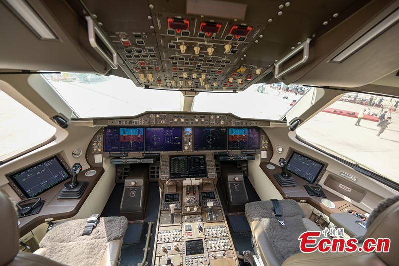 An interior view of cockpit of China's home grown C919 aircraft displayed at Hong Kong International Airport, Dec. 13, 2023. (Photo: China News Network/Chen Yongnuo)
