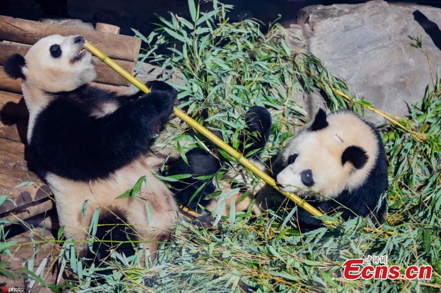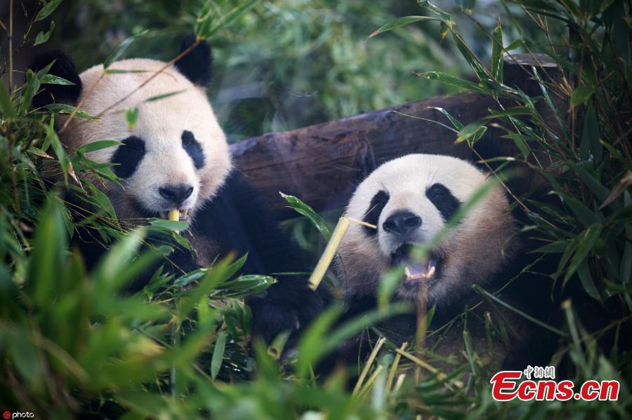 File photo shows giant panda twins Meng Xiang and Meng Yuan eat bamboo at Berlin Zoo, Germany, March 10, 2021. (File photo/ICphoto)
