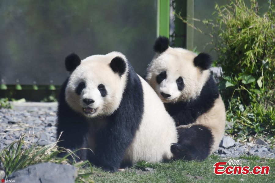 File photo shows giant panda twins Meng Xiang and Meng Yuan play at Berlin Zoo, Germany, April 21, 2021. (File photo/ICphoto)