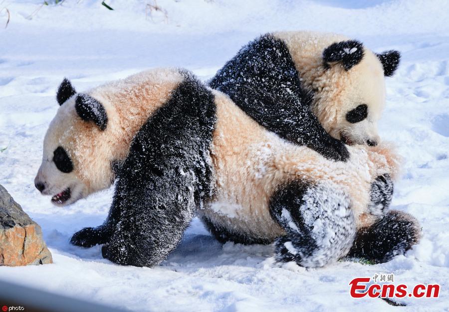 File photo shows giant panda twins Meng Xiang and Meng Yuan have fun in the snow at Berlin Zoo, Germany, February 2021. (File photo/ICphoto)