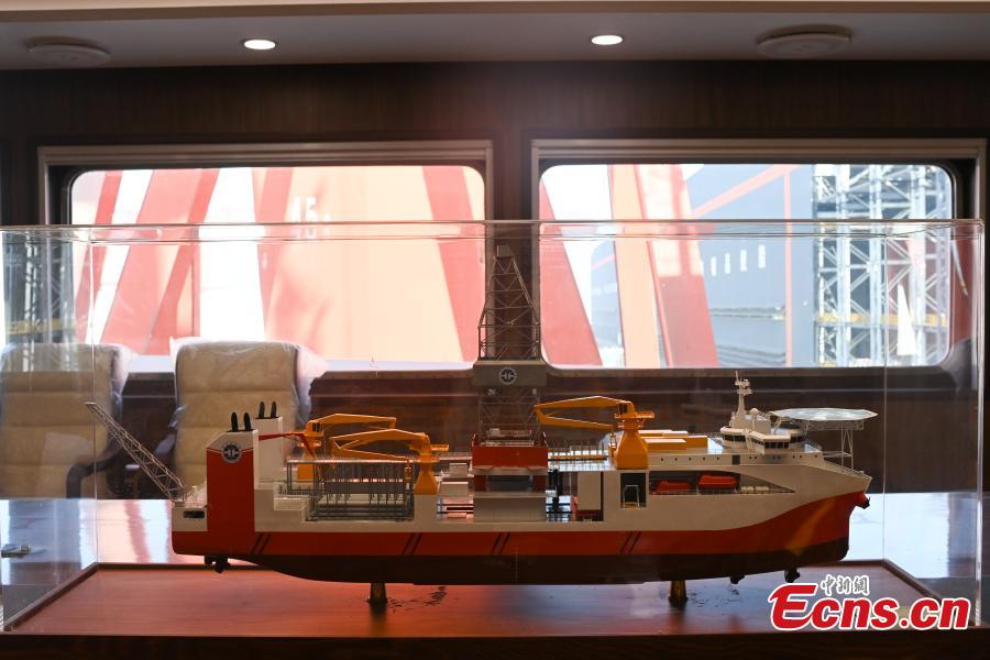 A model of China's first ultra-deepwater drilling vessel is displayed at a meeting room on the vessel at Nansha Port in Guangzhou, south China's Guangdong Province, Dec. 15, 2023. (Photo: China News Service/Chen Chuhong)